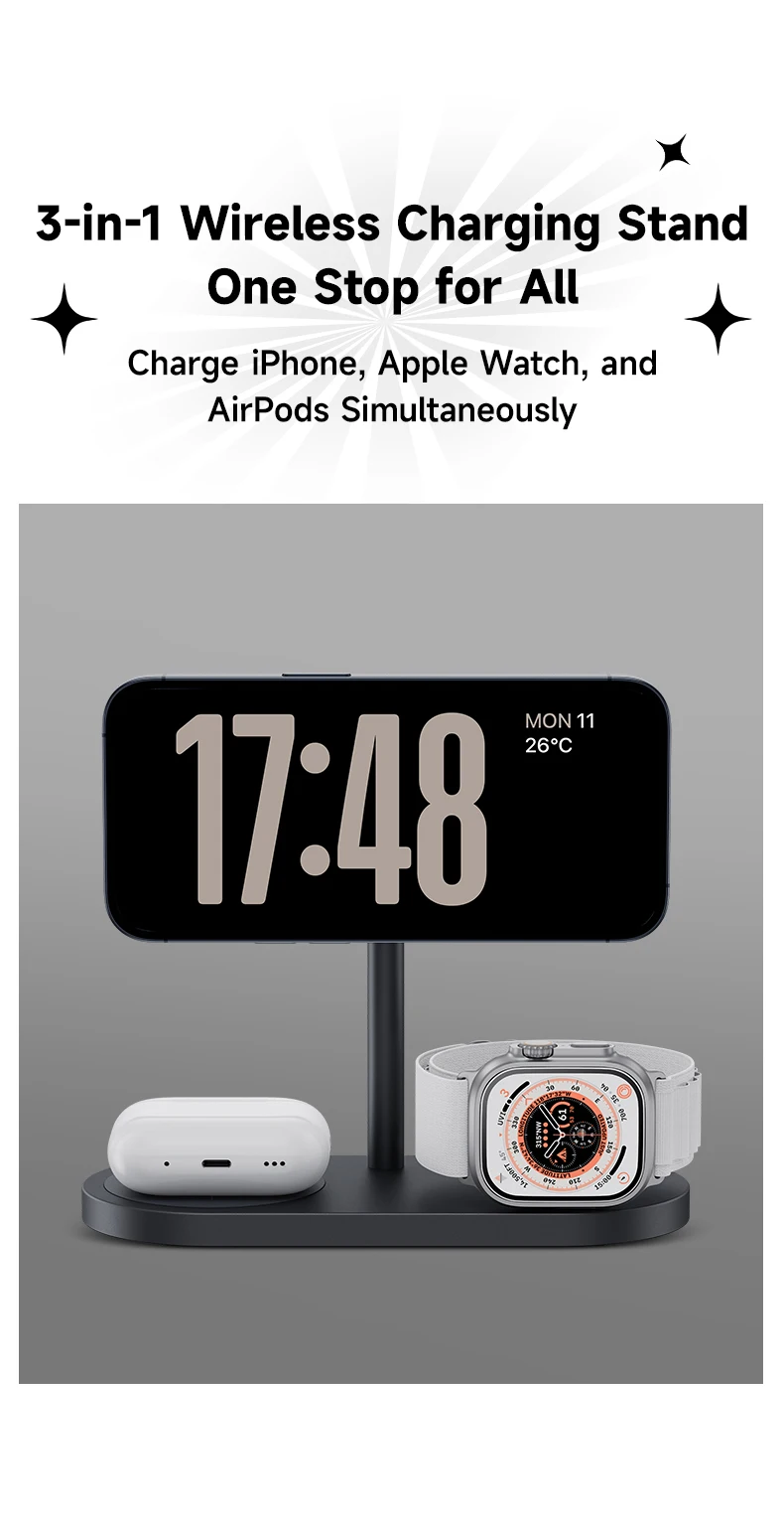 Versatile Charging Station: Experience the convenience of charging your iPhone, Apple Watch, and AirPods simultaneously with the Benks Infinity Omni 3-in-1 Wireless Charger Stand.
