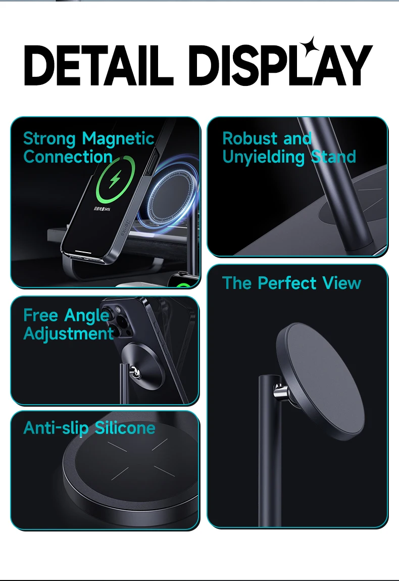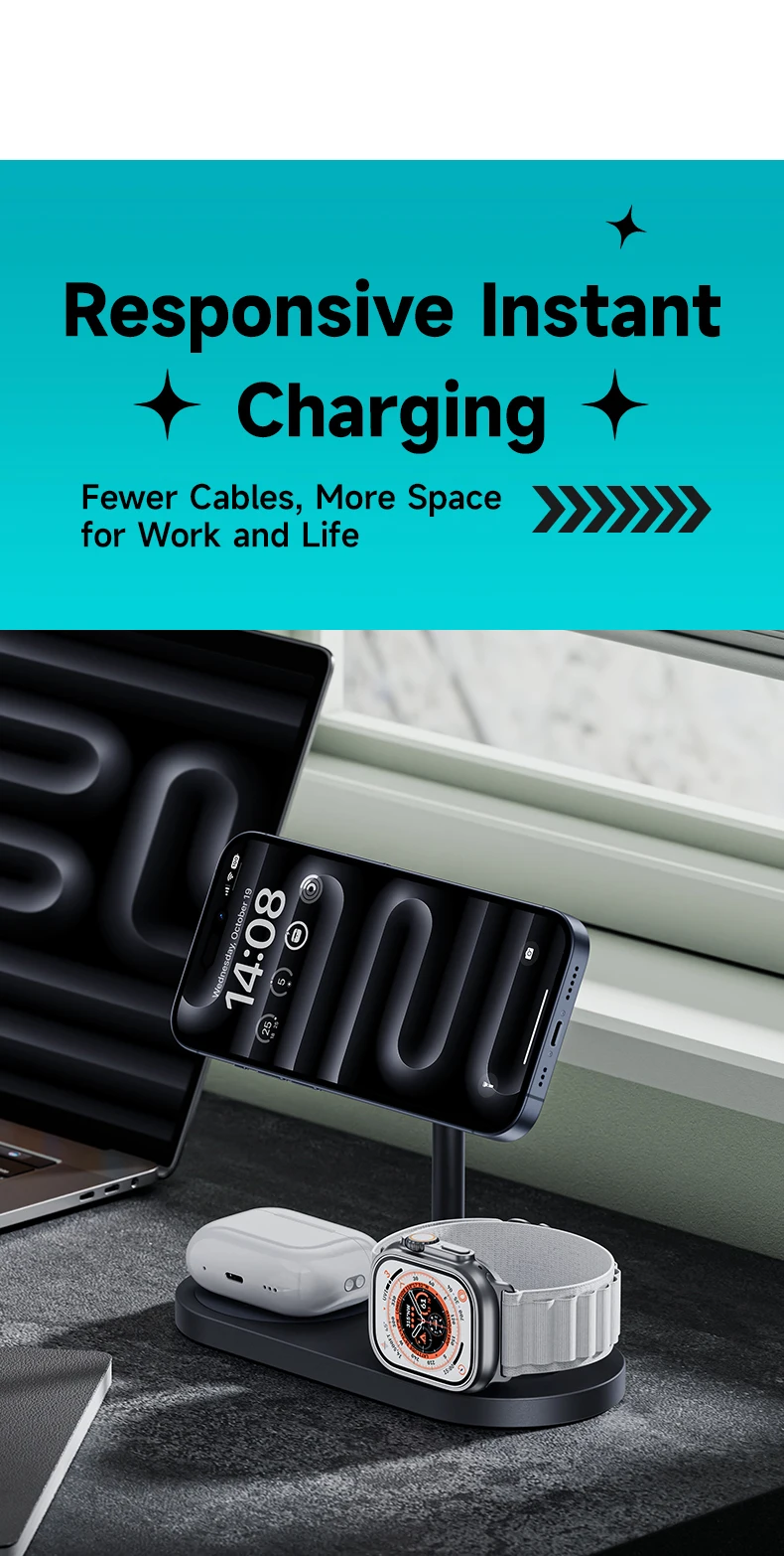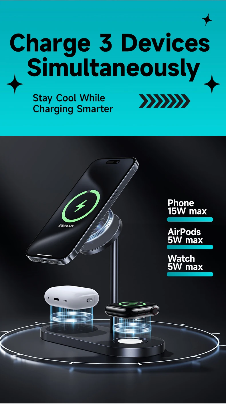 Strong Magnetic Connection: The charger features a secure magnetic connection, ensuring your devices stay in place during charging.