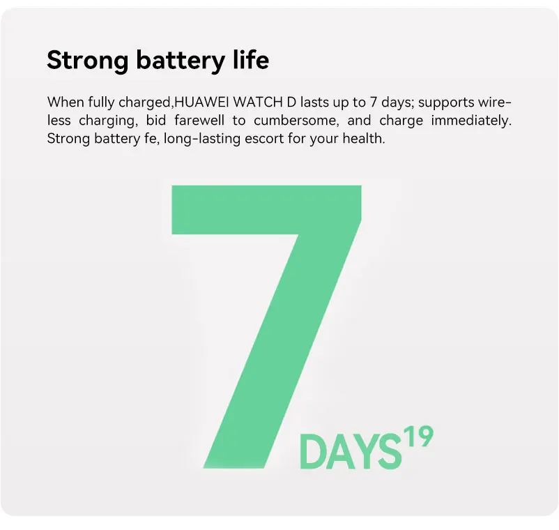 Long battery life. The HUAWEI Watch D features a long-lasting battery for up to 7 days so you can enjoy your daily life and focus on your lifestyle.