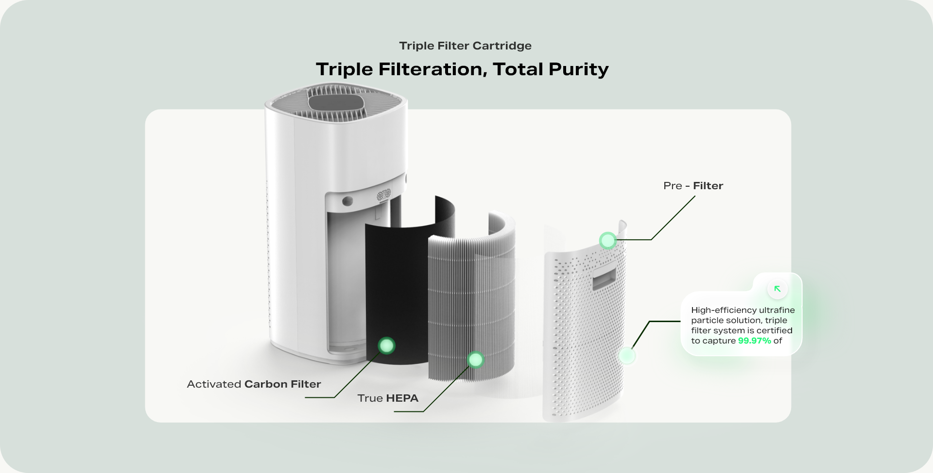 - Triple-Layer Filtration: Combines a Pre-filter, H13 true HEPA filter, and Activated Carbon to trap 99.97% of particles.