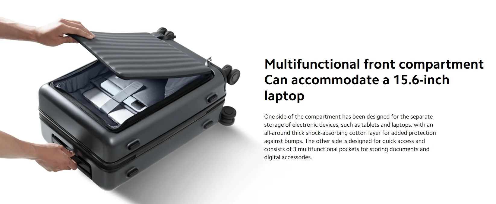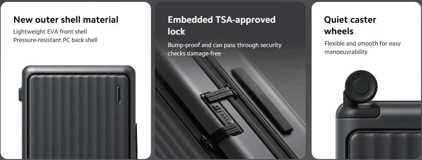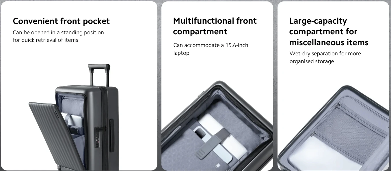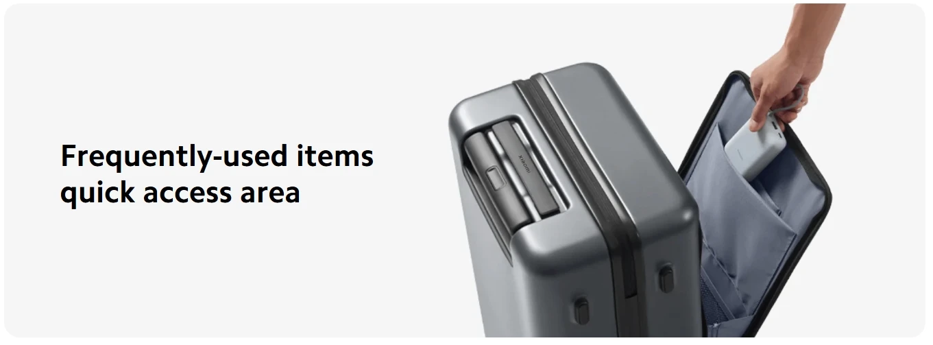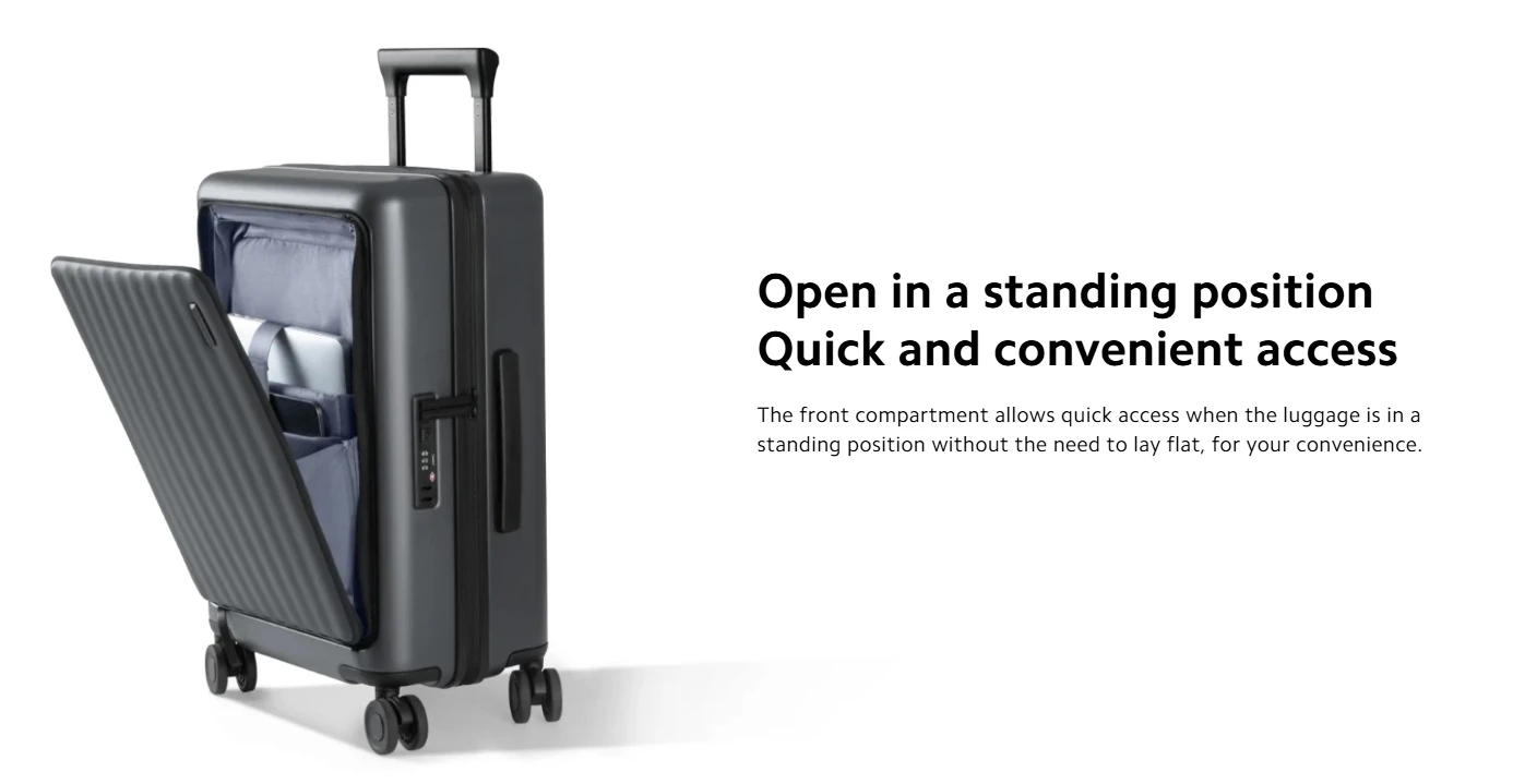 The front compartment allows quick access when the luggage is in a standing position without the need to lay flat, for your convenience.