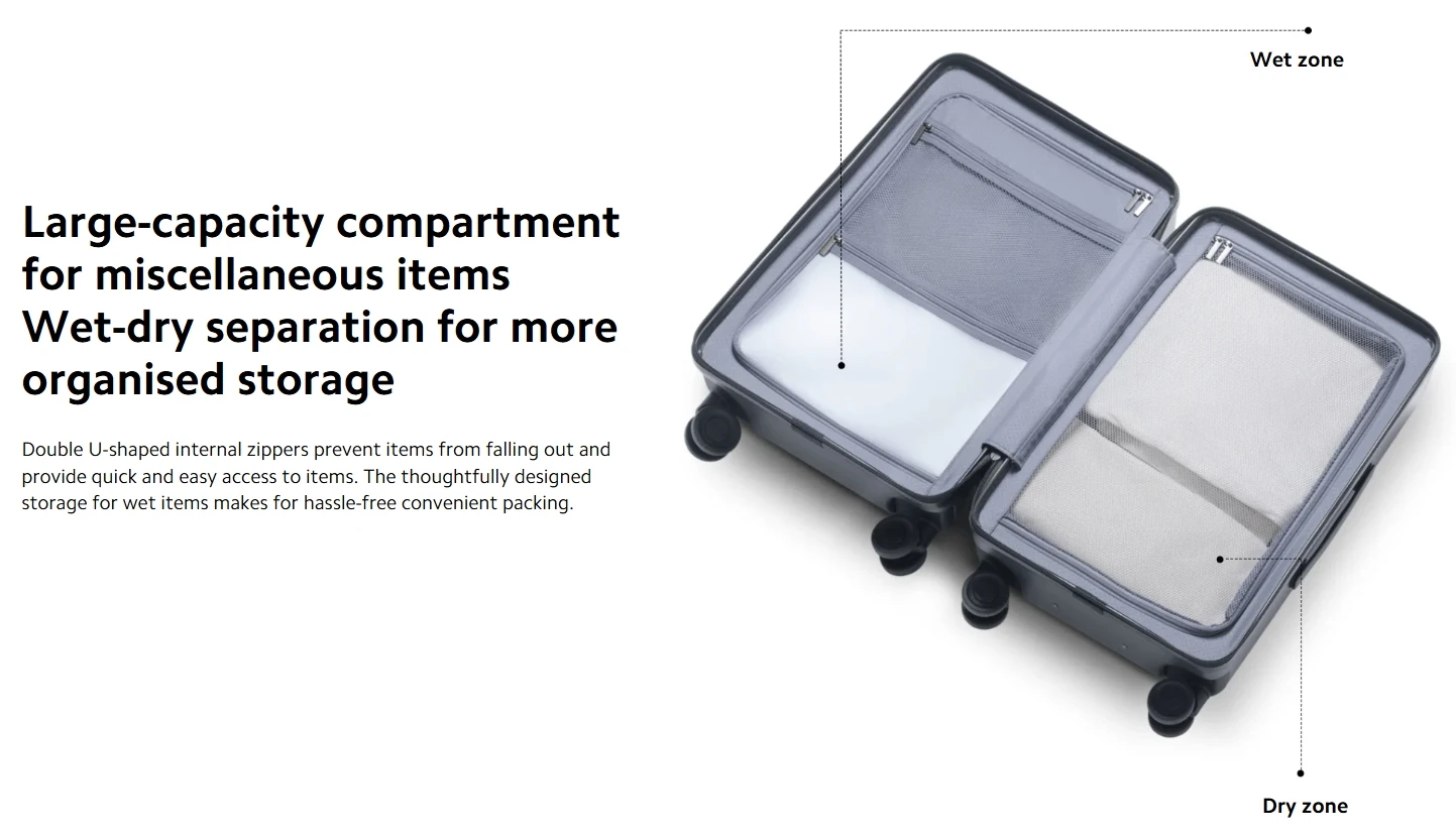 Double U-shaped internal zippers prevent items from falling out and provide quick and easy access to items. The thoughtfully designed storage for wet items makes for hassle-free convenient packing.