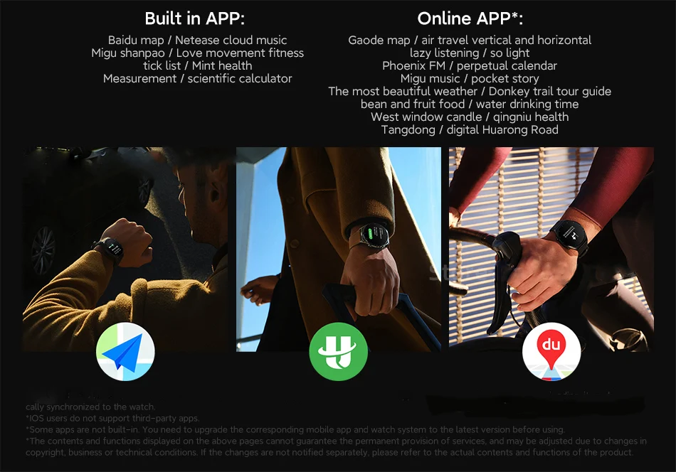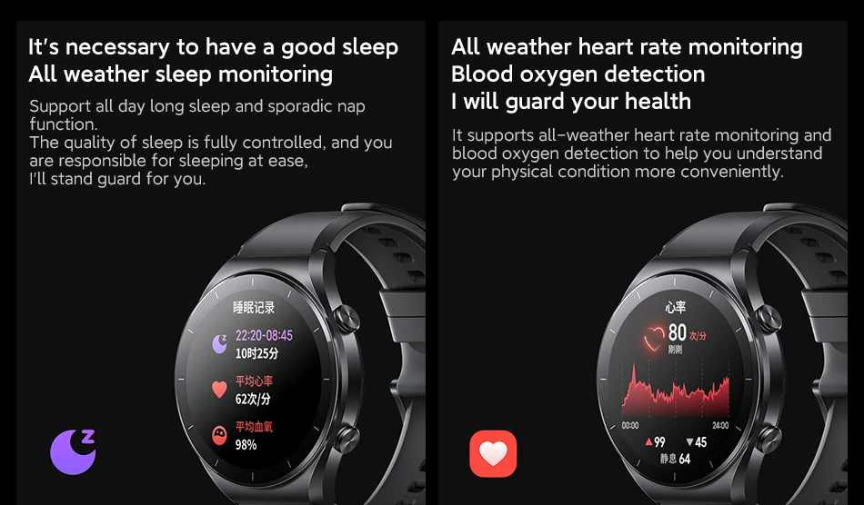 Sensors: Heart rate sensor (with blood oxygen sensor), accelerometer, gyroscope, geomagnetic sensor, atmospheric sensor, ambient light sensor